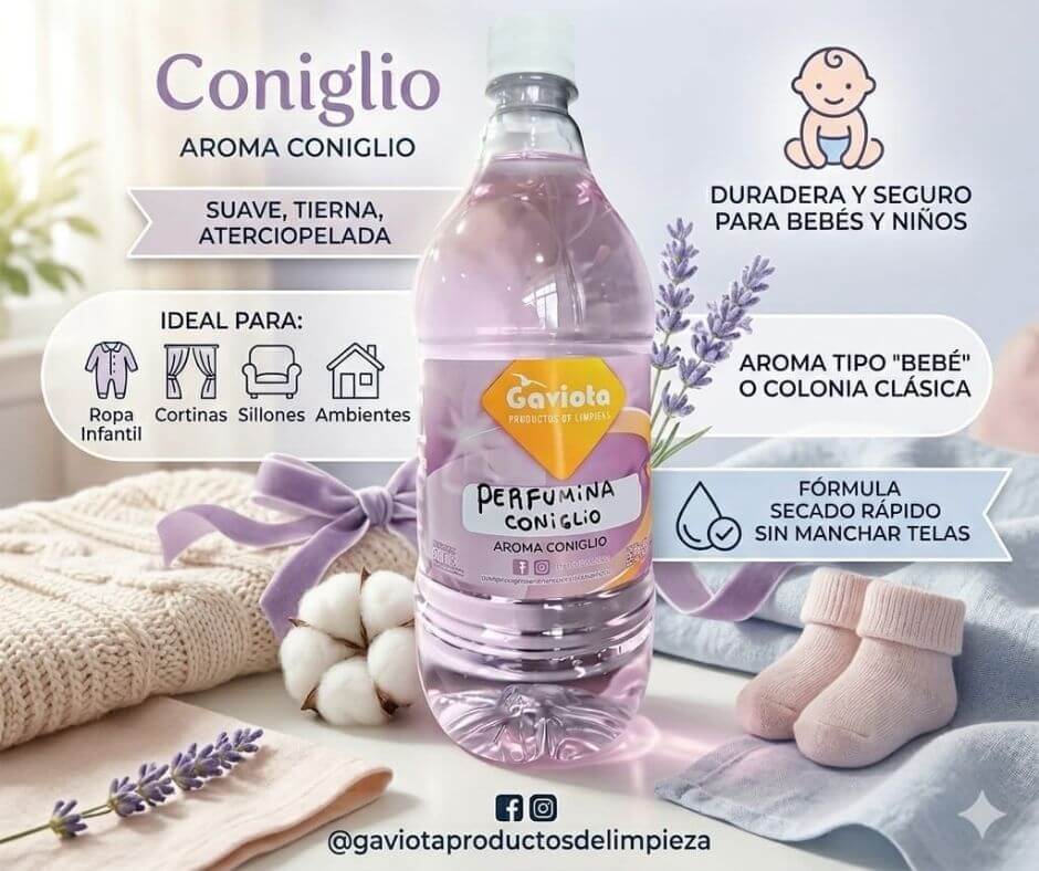 La perfumina textil Coniglio es una fragancia premium, popular por su aroma suave, dulce y aterciopelado, comúnmente asociado a la ropa de bebés (tipo Baby Coniglio/Vivex). Diseñada para textiles y ambientes, se destaca por su larga duración, versatilidad en cortinas, sillones y ropa, y la opción de adquirirse en versiones super concentradas o listas para usar